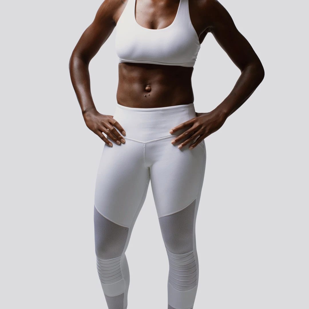 The Peak Leggings are a part of our AScudds Collection. These white sports leggings were designed by Alison with accent pleats just below the knee for extra durability against the barbell. She also added mesh panels for a unique and sexy look, plus ventilation. The Peak Leggings also feature a mid-rise waist along with a double lining in the back to prevent them from being see-through, showing panty lines and to give you a bit of extra sweat protection. You are sure to love the fit, feel and coverage of these ladies’ white leggings with mesh panels.