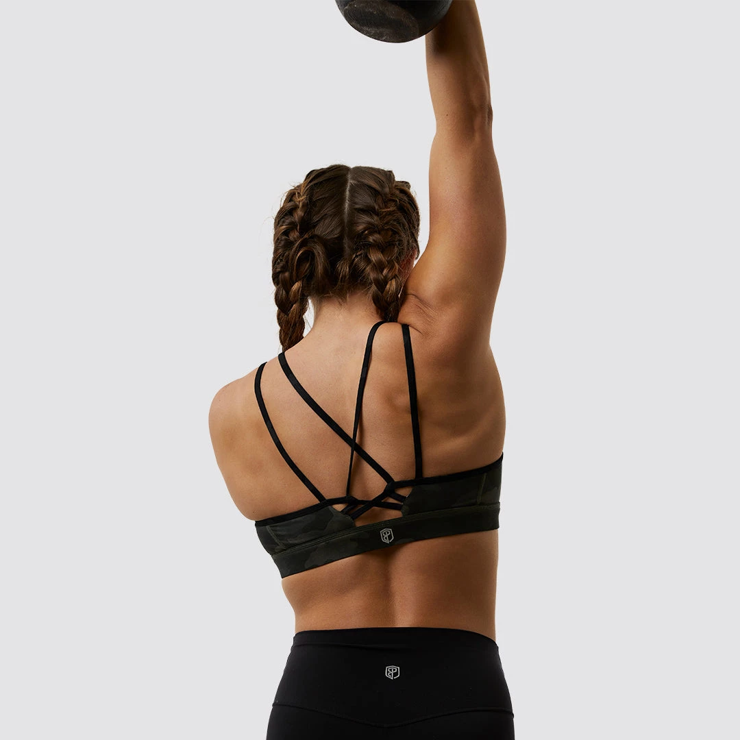 The Lotus sports bra features a cute and unique back with 4 straps. The front offers moderate coverage and a traditional style band around the bottom.