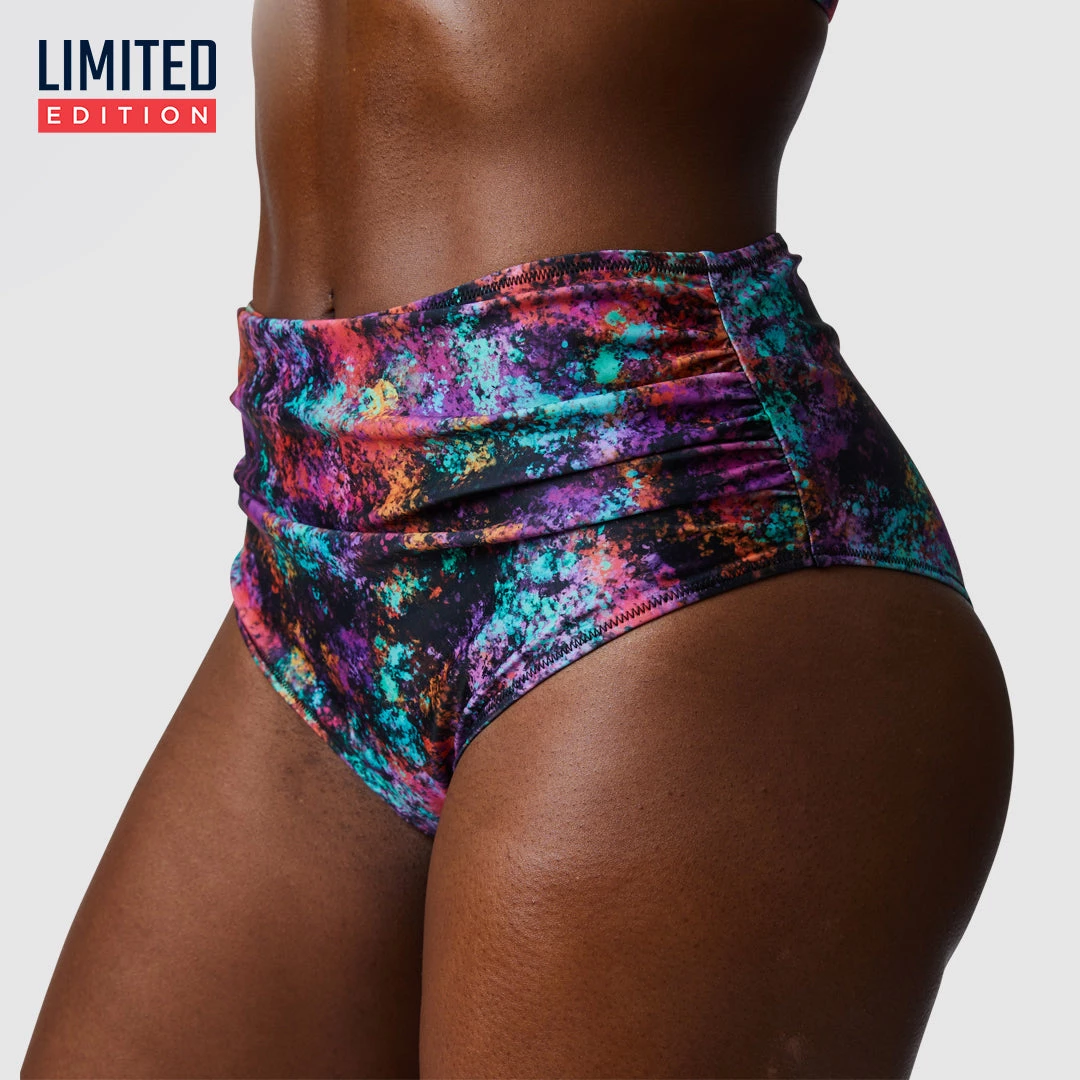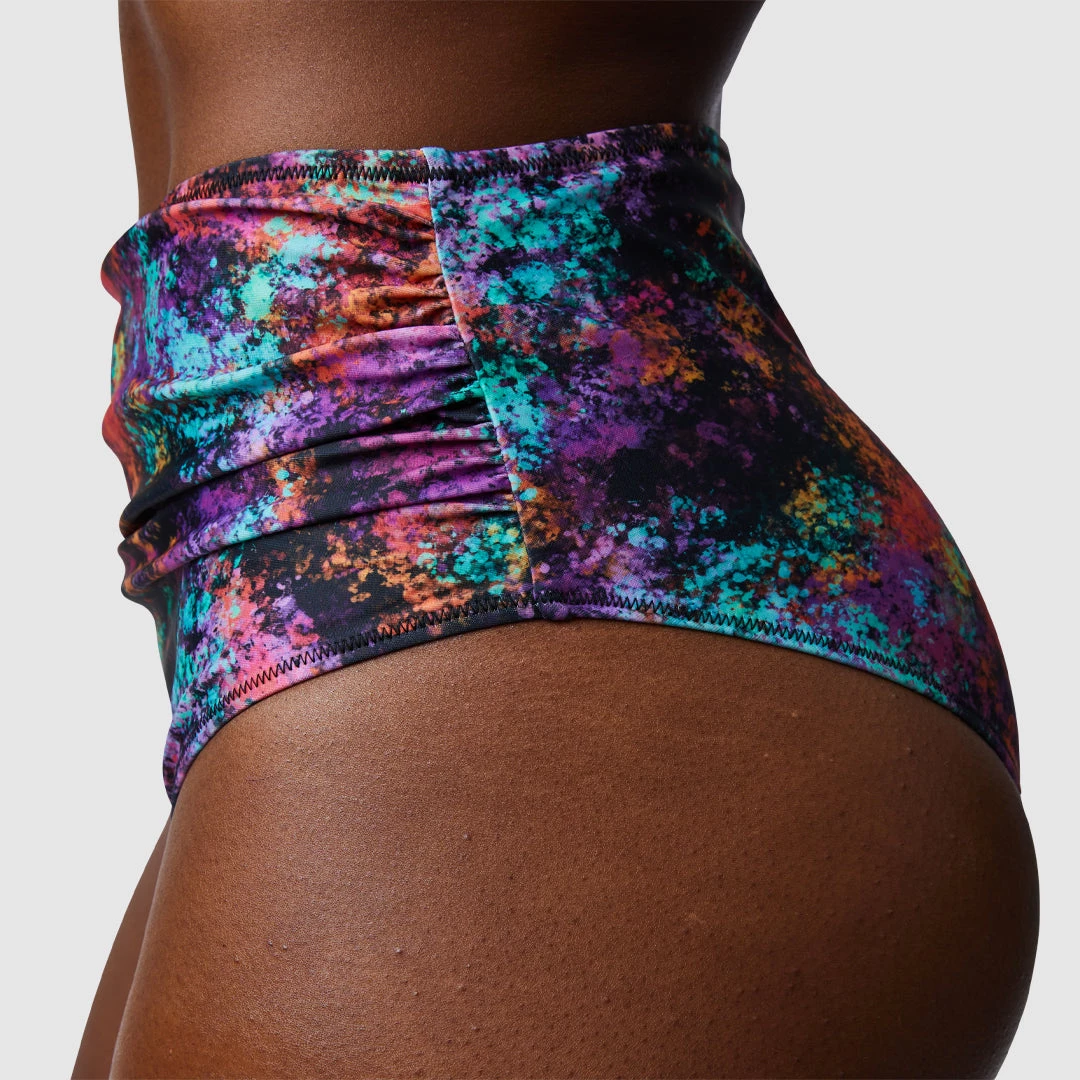 The Carefree Bikini Bottoms are a high waisted, medium coverage bottom. The front has a ruched design in the waistline.