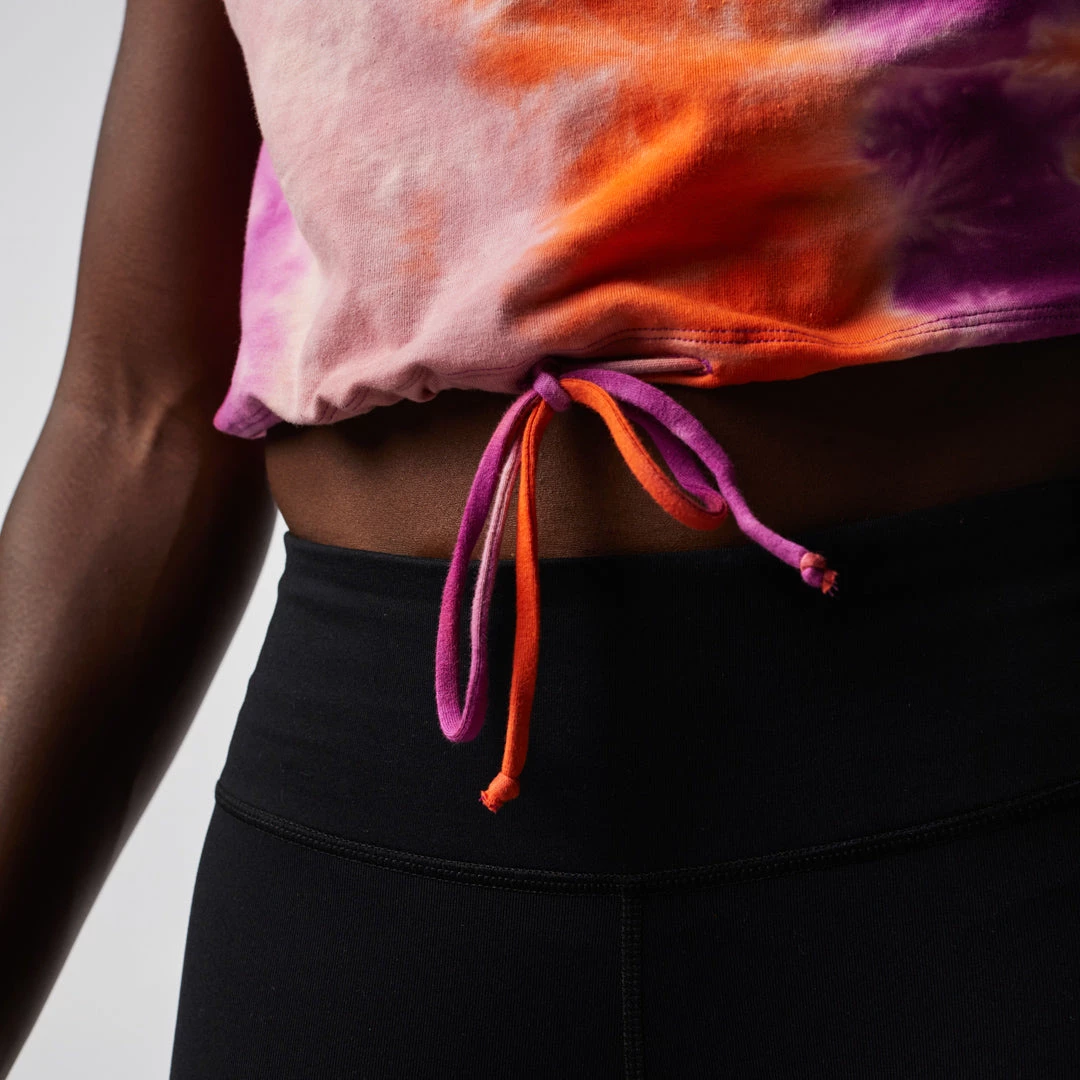 The Cropped Tie Dye Tee features cuffed sleeves and a cropped length draw string bottom.