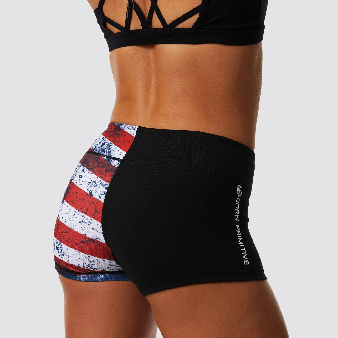 These women’s fitted workout shorts are form fitting and made from an extremely comfortable material. These American flag short shorts feature a longer inseam to keep you covered and the perfect structure of elasticity around the bottom of the short leg to prevent them from digging into your thighs. These women’s patriotic workout shorts feature our logo centered on the back waistband.[break]
