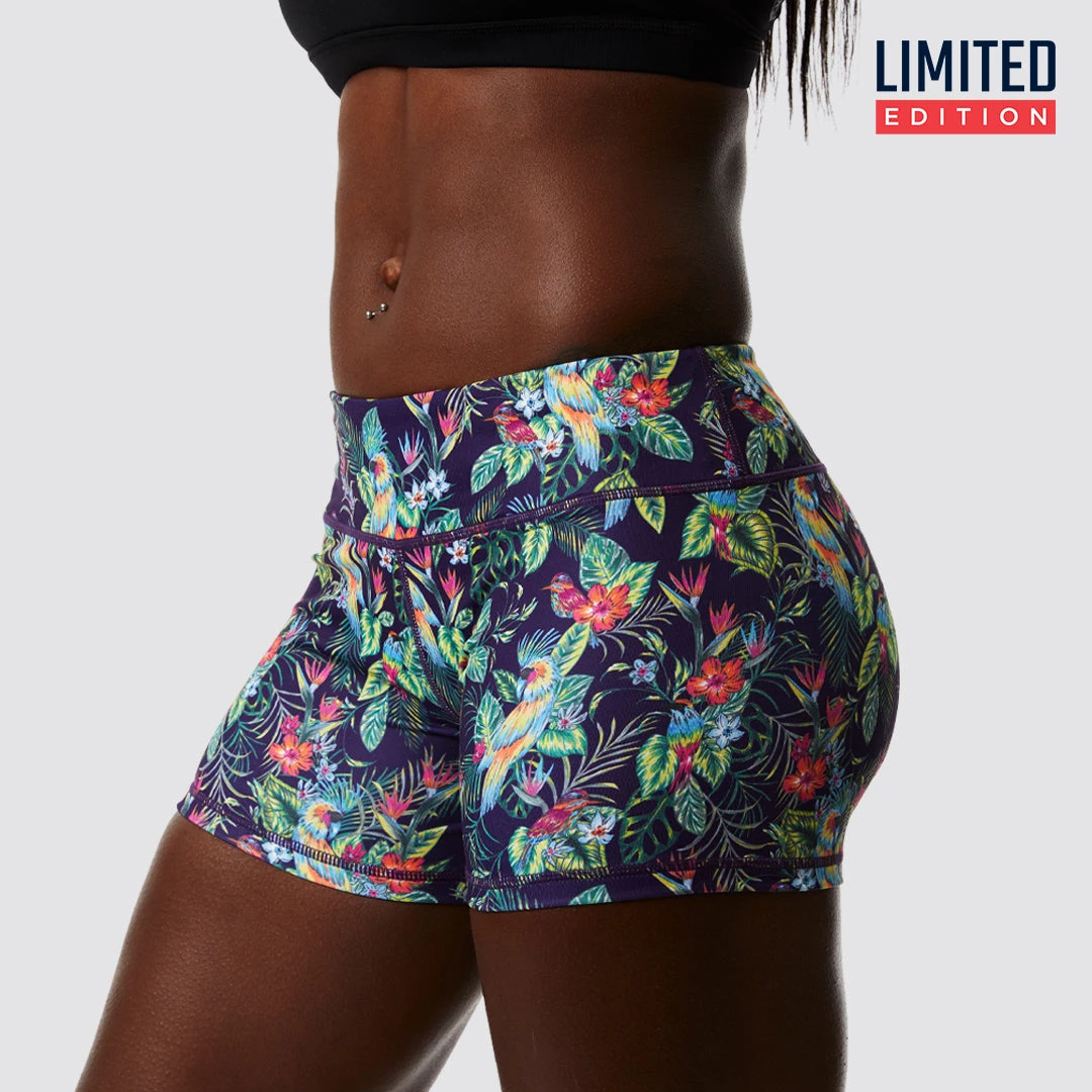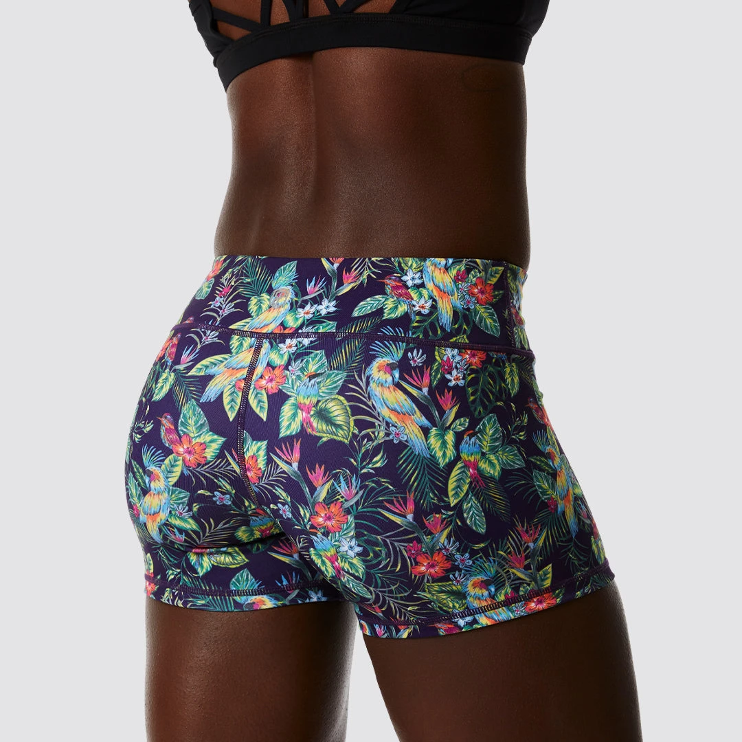Fitted workout shorts in a form fitting, extremely comfortable material. These women’s tropical pattern workout short shorts feature a longer inseam to keep you covered and the perfect structure of elasticity around the bottom of the short leg to prevent them from digging into your thighs. These tropical shorts for women feature our logo centered on the back waistband.[break]