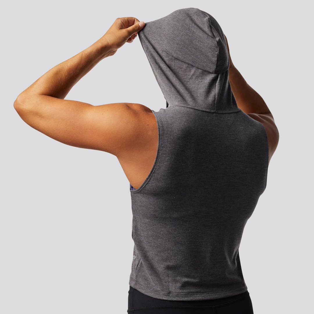The Good Vibes Cropped Sleeveless Hoodie features a sleeveless cut with cropped length. The hood with draw strings completes the look. This is a fun top to wear in or out of the gym.