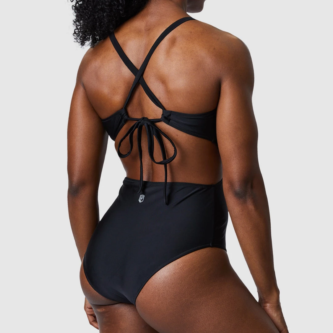 The Isle All Black One Piece Swimsuit features a criss cross front with adjustable straps that cross and tie in the back allowing for a customized fit.