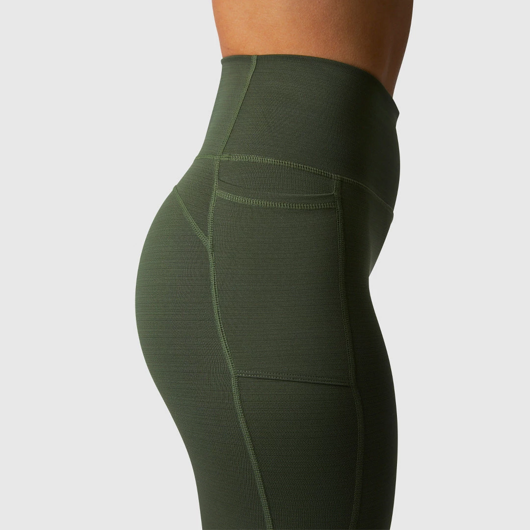 The Rise Leggings feature a new fabric that has a subtle stripe design. These leggings have four-way stretch, a high waist, 7/8 length and also feature Pockets!