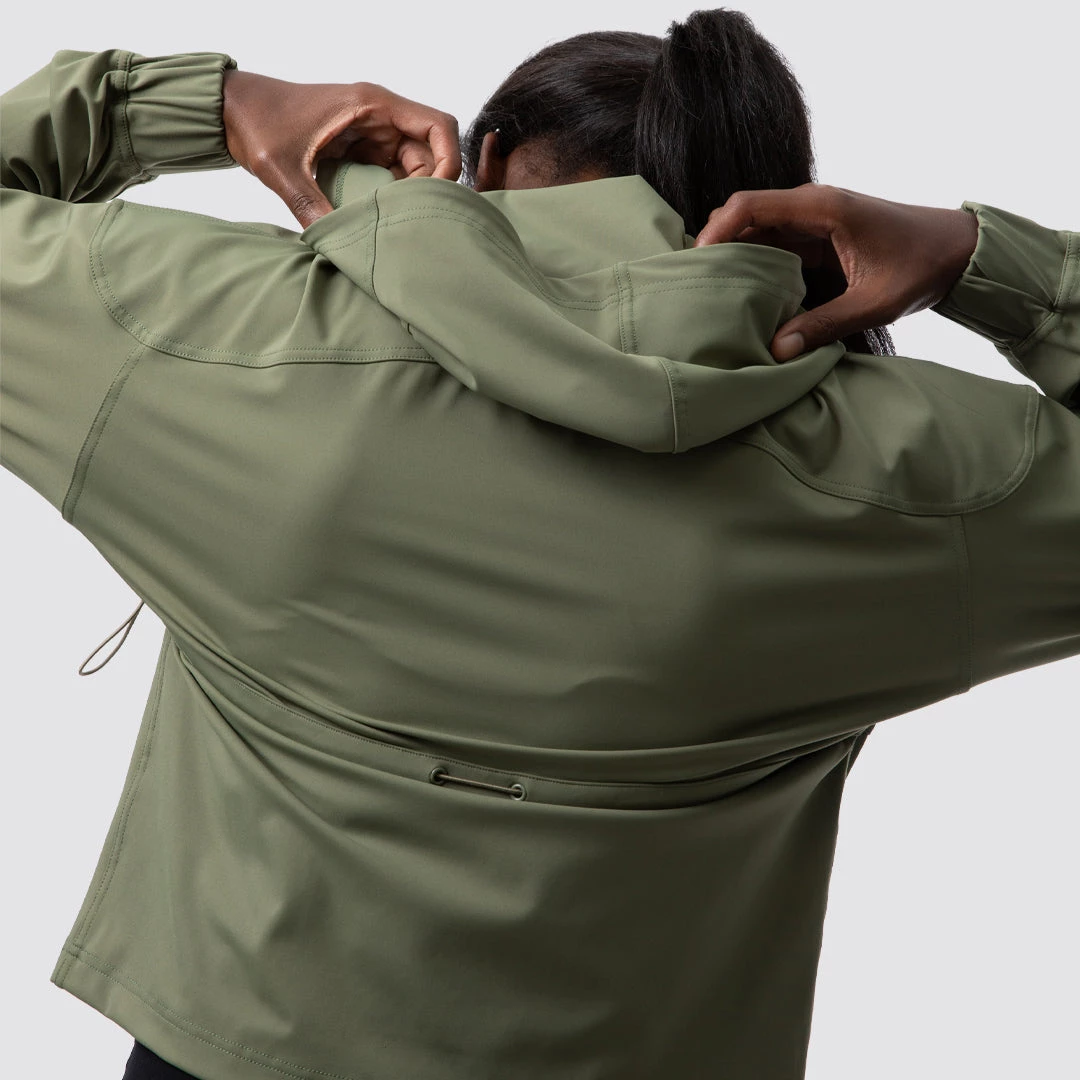 The Weekender Pullover features an amazing new material that is soft and stretchy. This pullover has a 1/2 zipper, a hood and a pouch pocket in the front. There is also a slide cinch around the rib cage. This pullover hits right around the waist.