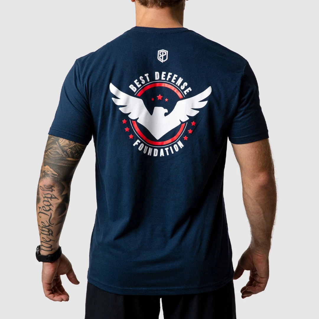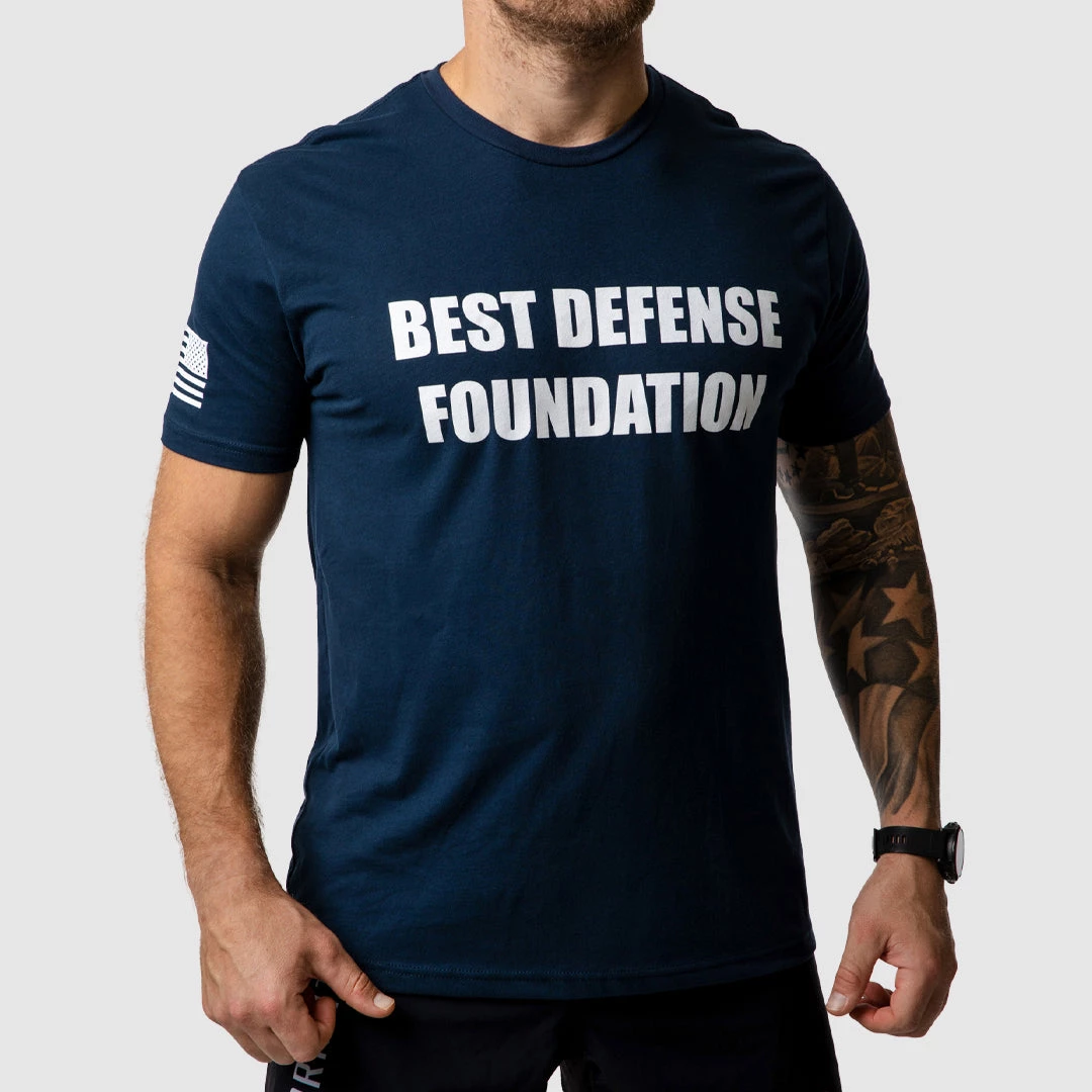 This ultra soft sueded tee in midnight navy features the Best Defense Foundation on the front and their logo on the back.