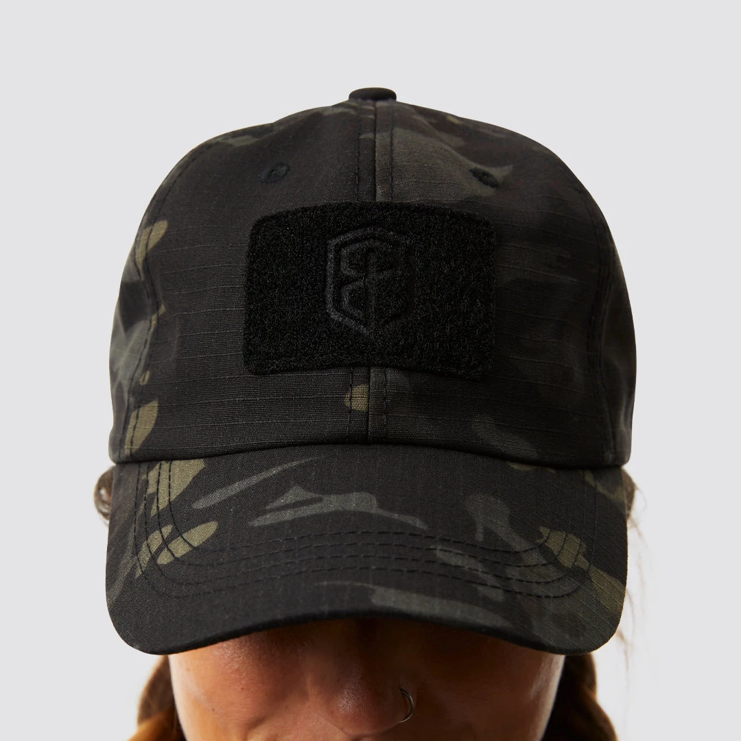 The Born Primitive Operator Hat in Black Camouflage features a black camouflage pattern with a hook and loop black patch for attaching your favorite flag patch or morale patch with the BP shield embroidered into the center of the hook and loop.