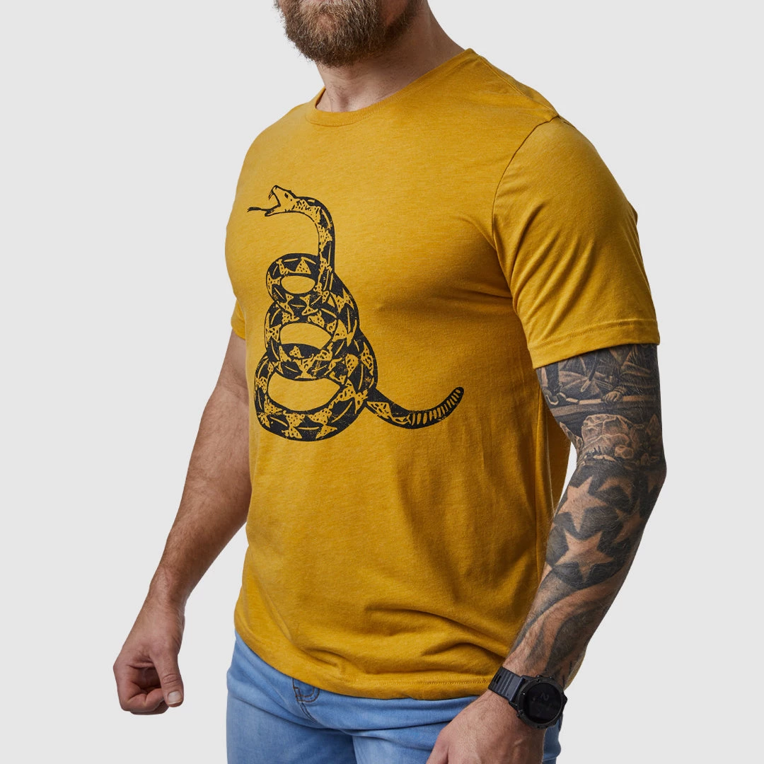 As an active-duty military owned company, this symbol holds significance for our brand. Dating back to the Revolutionary War period when it was originally referenced by Benjamin Franklin as the symbol of American spirit, this flag represented the American defiance as we fought for our independence. Colonel Christopher Gadsden of the Continental Marines brought this flag out on the water for our country’s first naval mission and presented it to the Commodore of the Navy to fly in the formation. Today, the Gadsden symbol is still worn as an official patch on the left shoulder of naval uniforms, and it pays homage to our forefathers who were bold and daring enough to fight for their independence and establish the freedoms we enjoy today. Order this Gadsden flag shirt for yourself.