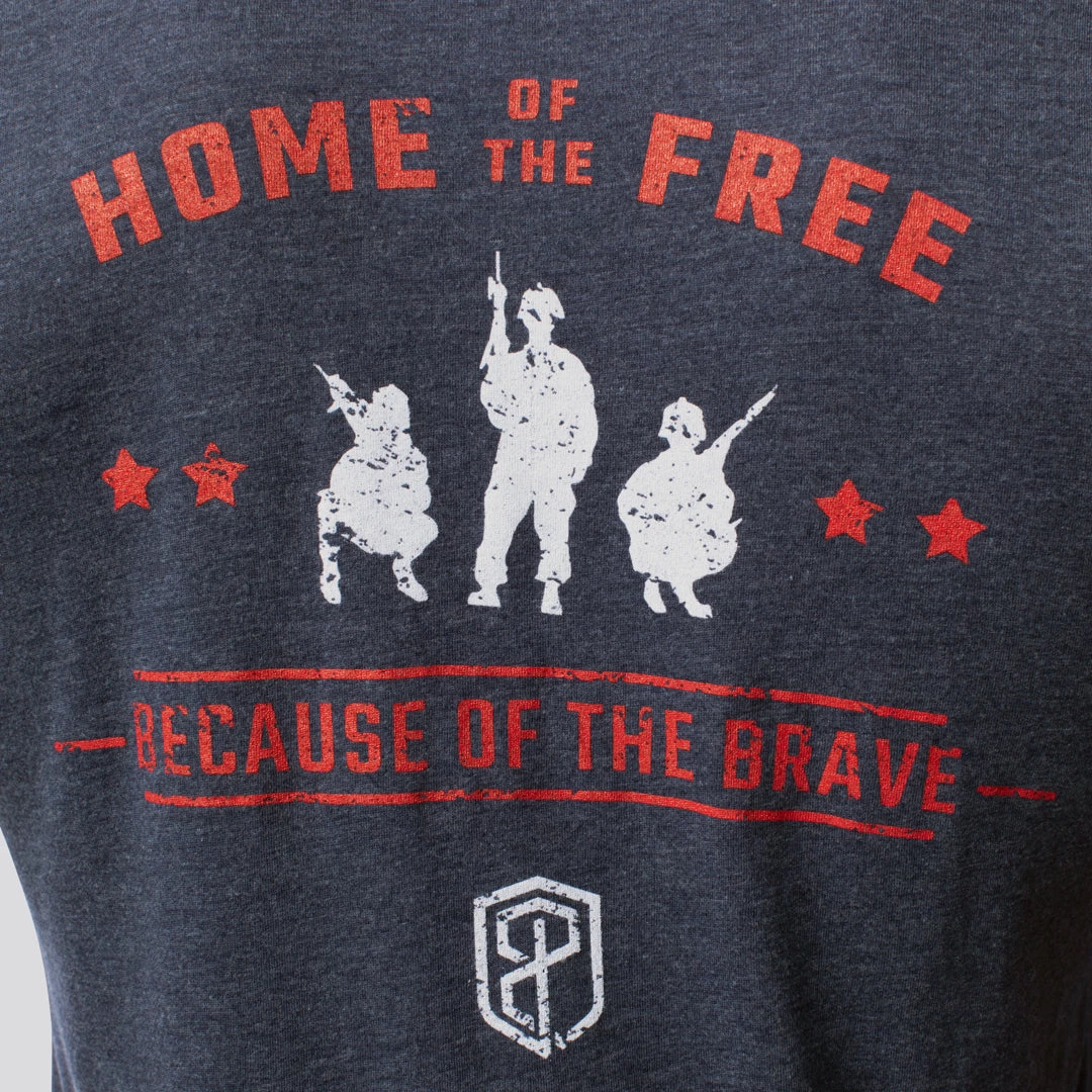 Our Home of the Free Because of the Brave t-shirt features a flag on the left chest and large picture and saying on the back.