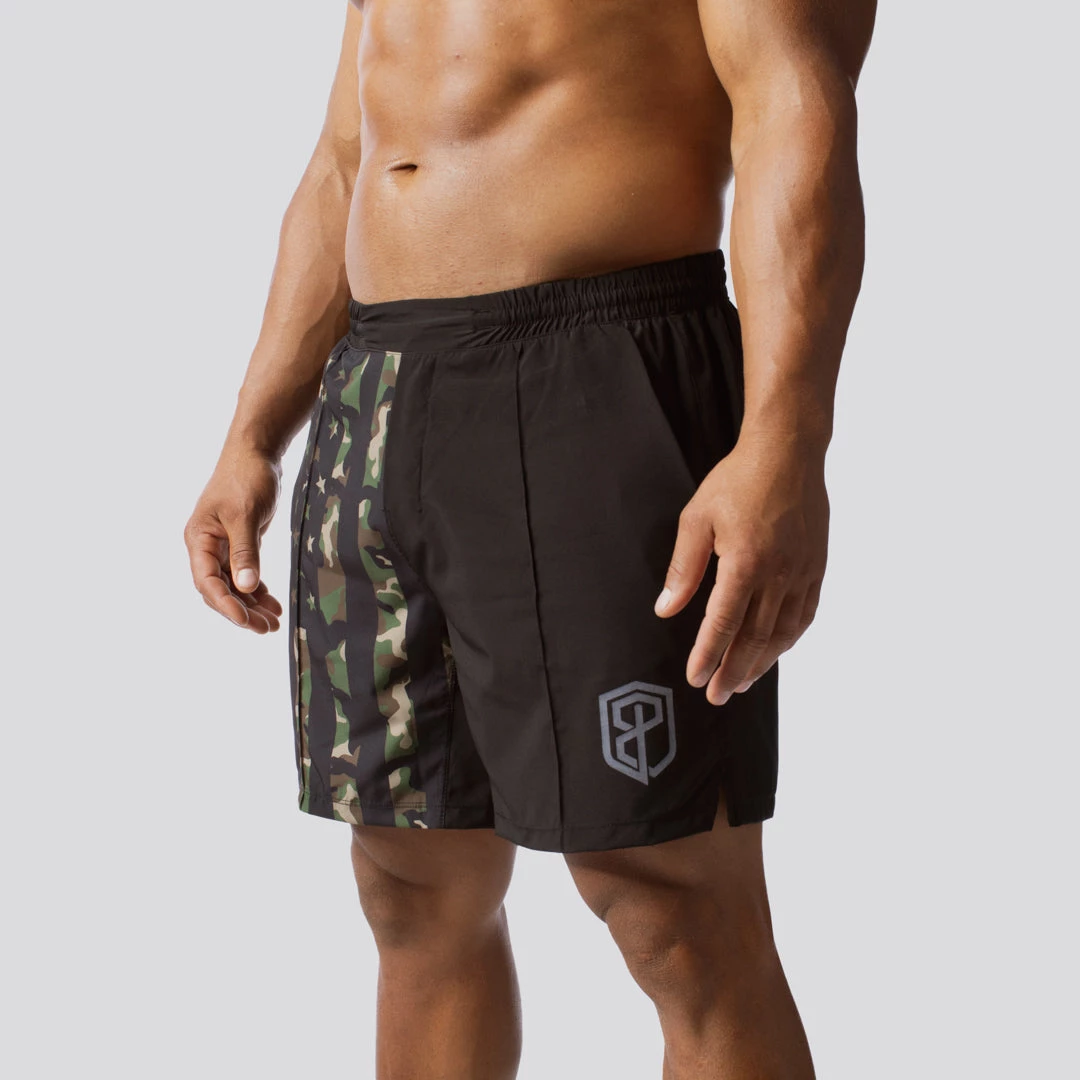 We designed these to be an all-purpose training short with performance in mind. These camouflage board shorts feature a lightweight, quick-dry fabric with moderate elasticity to ensure mobility. They feature two pockets in the front and a discrete, low-profile zipper pocket on the back to secure your belongings. The elastic waistband is paired with a drawstring to help keep your shorts secure in any environment. Whether you are hitting the gym, the trail, the water, or the ring, these American flag gym shorts will perform.