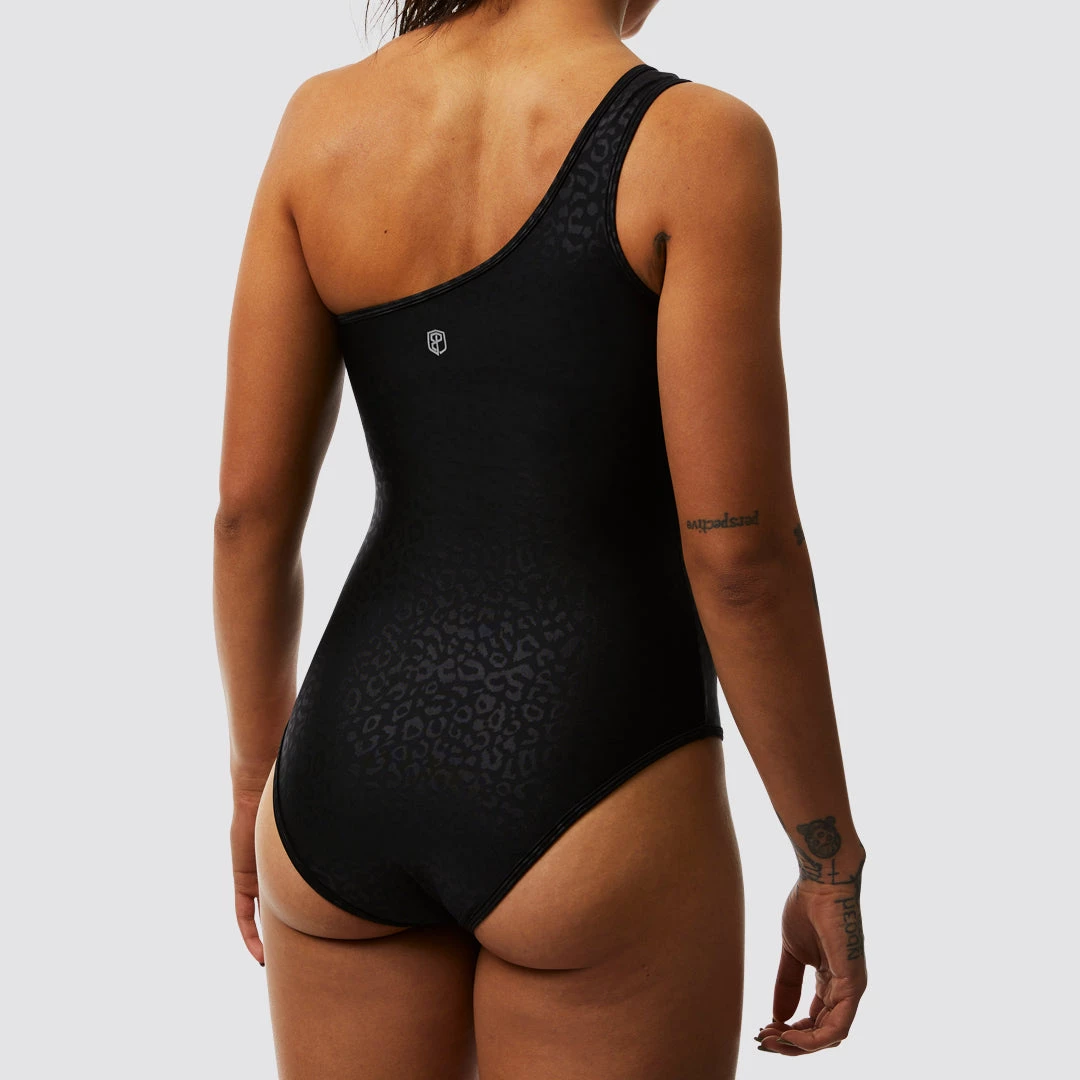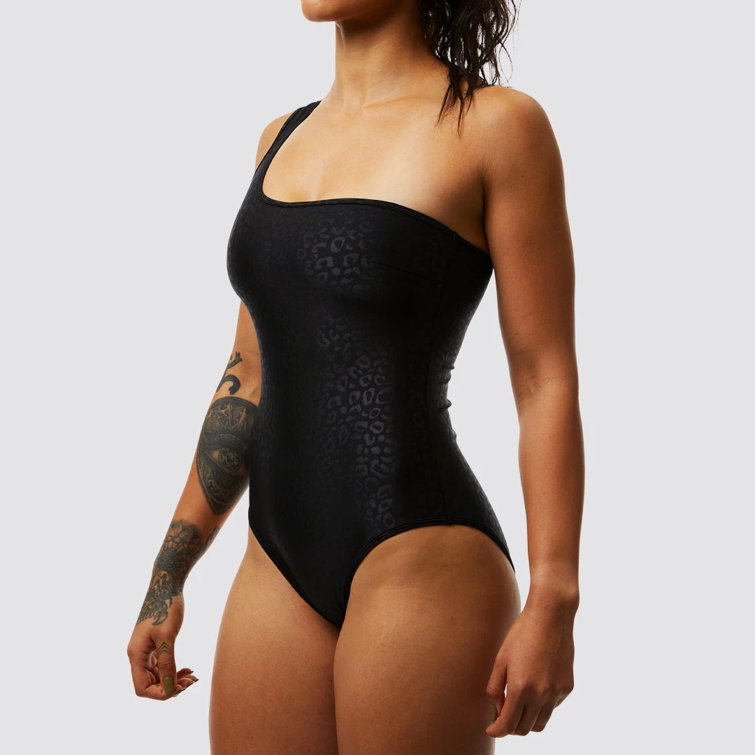 The women’s black one shoulder strap one piece swimsuit features a single shoulder strap.