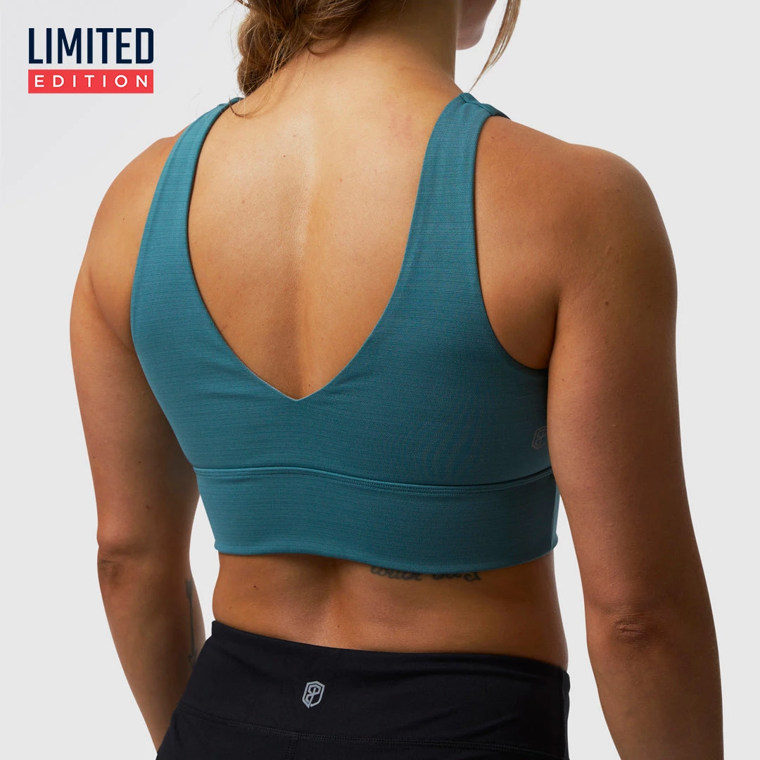 The Rise Flex Sports Bra features a new fabric that has a subtle stripe design. This sports bra features an extended body fit with a thick lower band and straps that form a V-shape in the back.