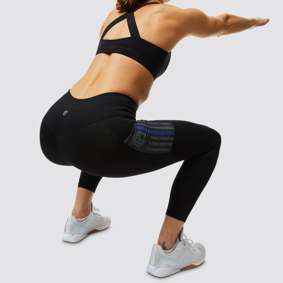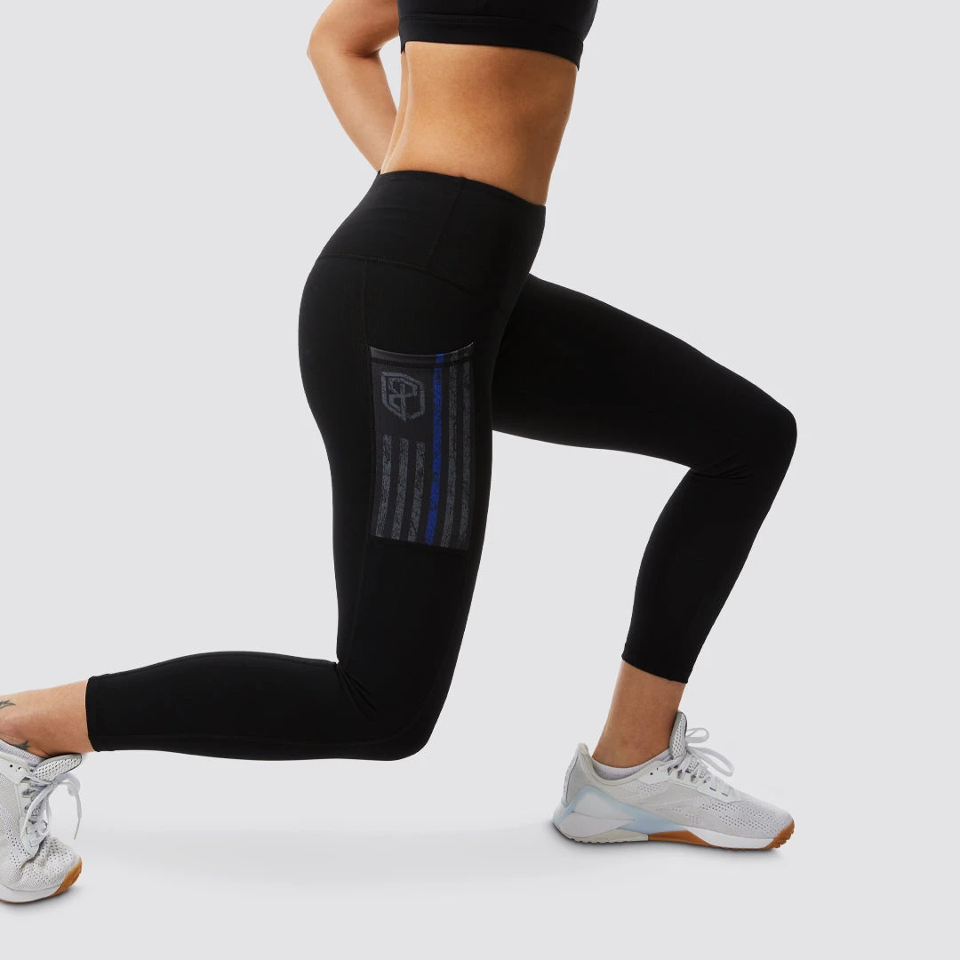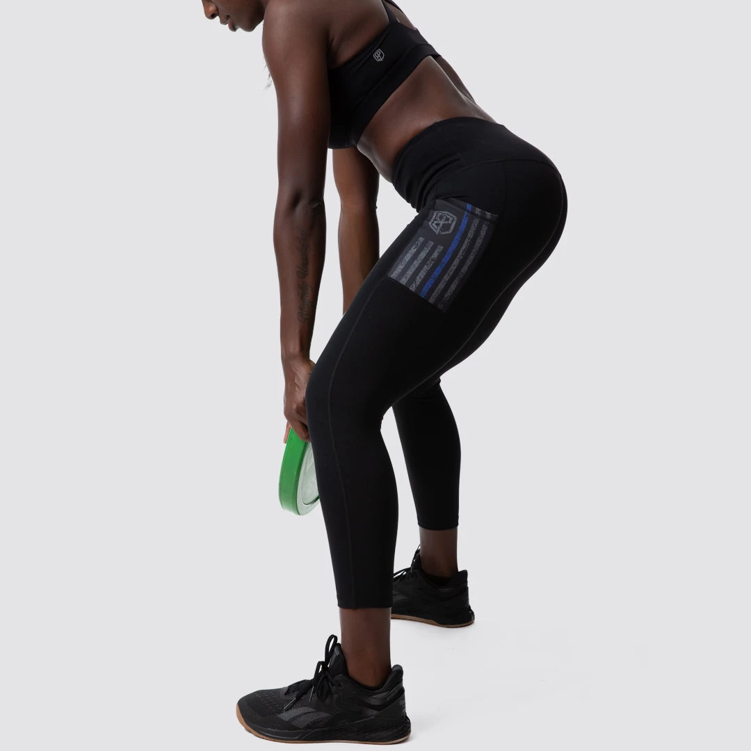 Rise & Grind black workout capri pants feature dual pockets on both outer thighs with a Thin Blue Line flag in Gunmetal and a wide waist band that you won’t have to constantly adjust. These capris offer a form fitting supplex material- feel of cotton with the benefits of advanced fiber technology. These are a “longer capris” and will hit mid-calf versus just below the knee!