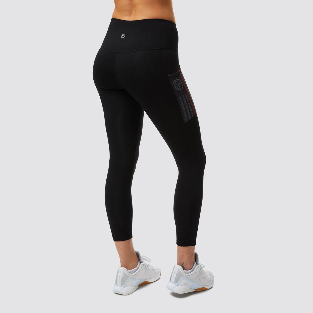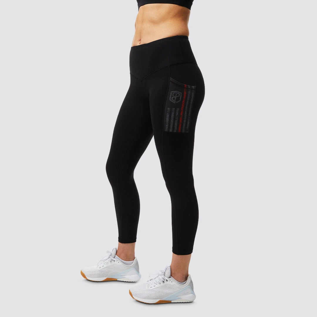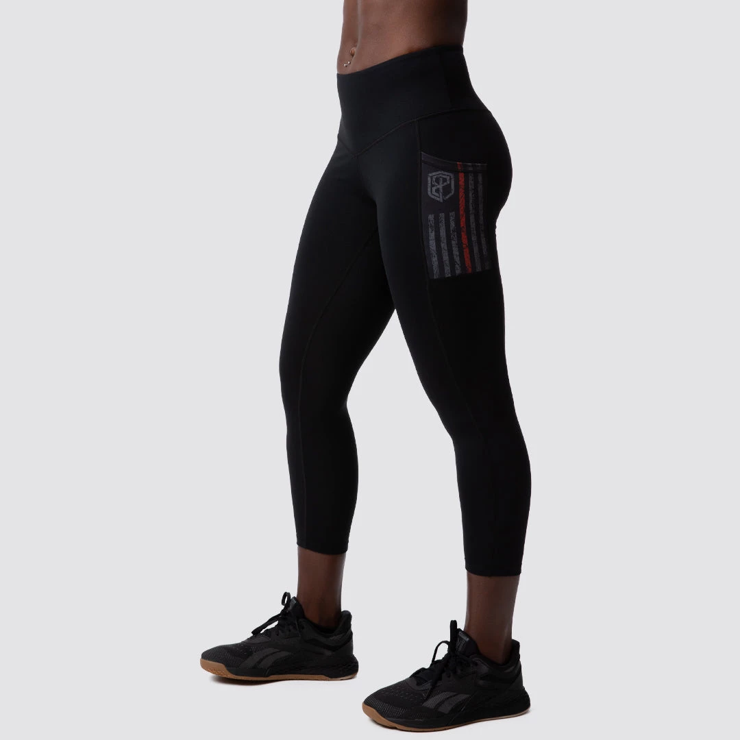 Rise & Grind black workout capri pants feature dual pockets on both outer thighs with a Thin Red Line flag in Gunmetal and a wide waist band that you won’t have to constantly adjust. These capris offer a form fitting supplex material- feel of cotton with the benefits of advanced fiber technology. These are a “longer capris” and will hit mid-calf versus just below the knee!