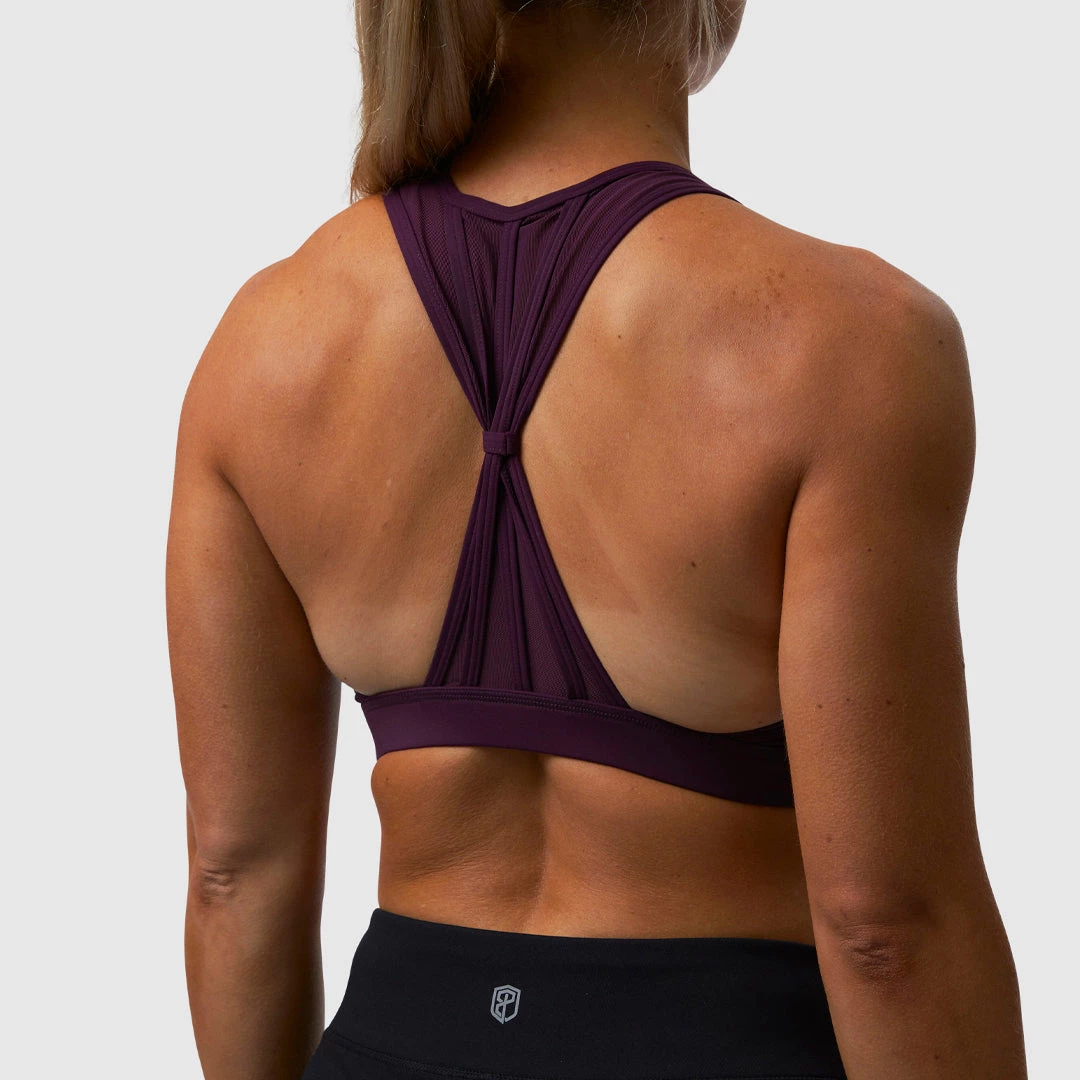The Berry Bra is a part of our Bethany Shadburne Collection. It was curated by Bethany herself and features a high neck, mesh detailing with an overlay of asymmetrical straps. This women’s dark purple high neck sports bra is perfect for mix and matching with your favorite Born Primitive Leggings and Booty Shorts year-round.