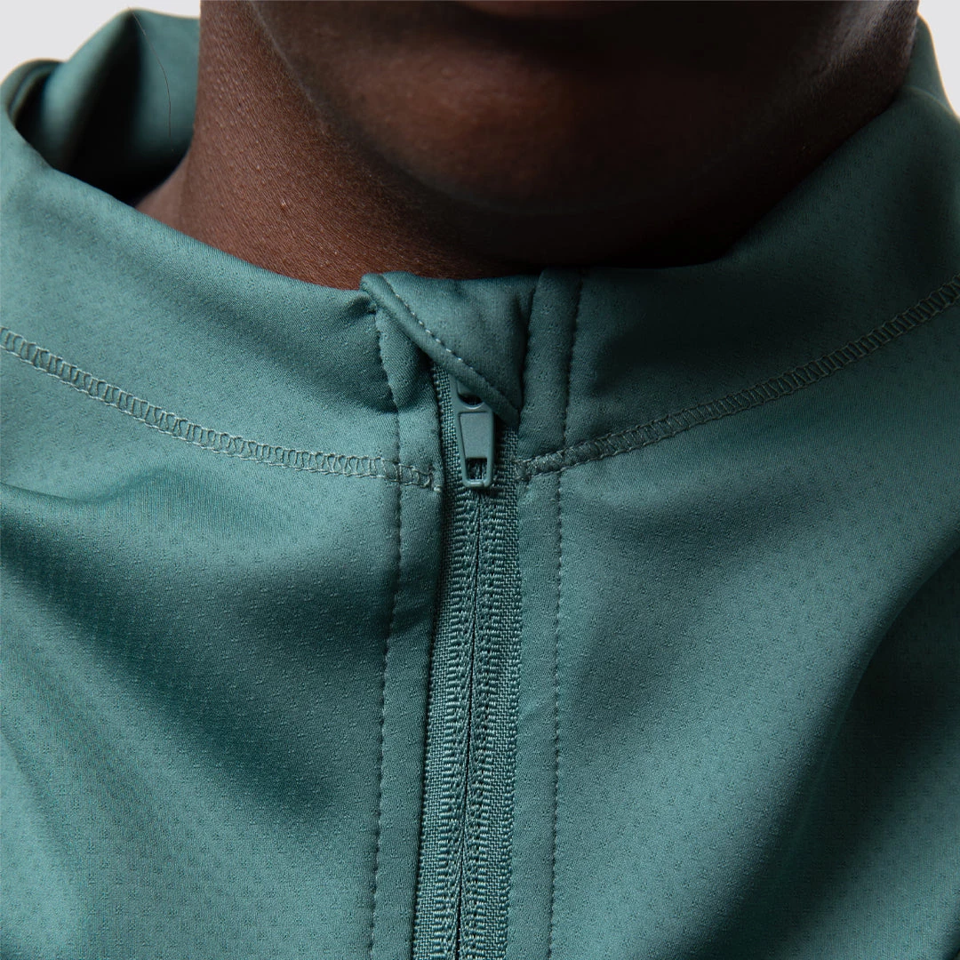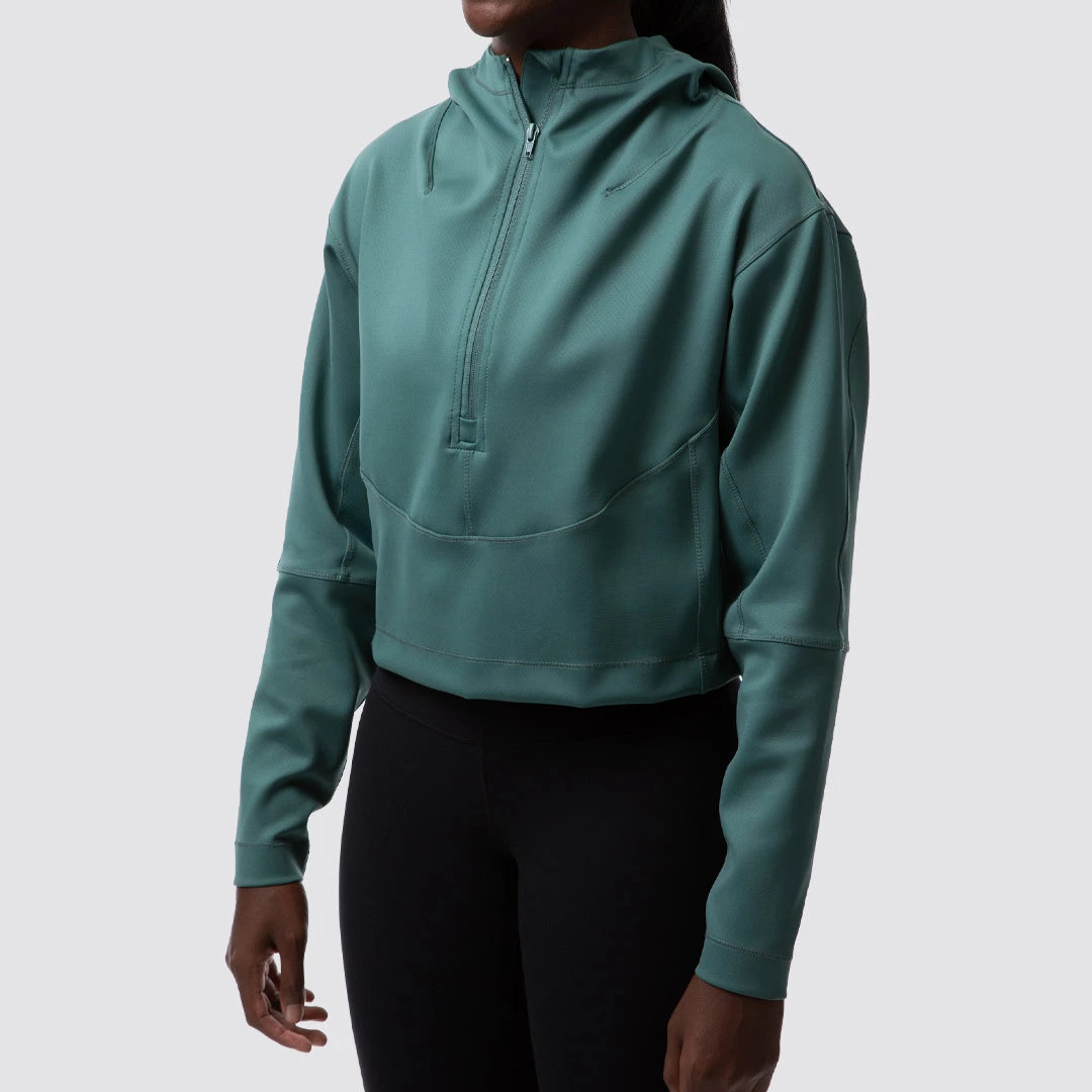 The Convertible Pullover features an amazing new material that has a dotted pattern. This pullover has a 1/2 zipper, a hood and features a cropped length.
