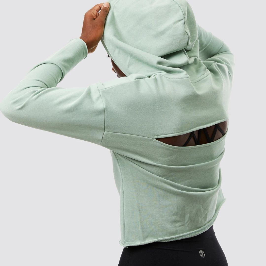 The Flashback Hoodie features a slightly cropped fit with a raw hem. A cut out in the back allows you to show off your Born Primitive sports bra. There is a hood with adjustable drawstrings.