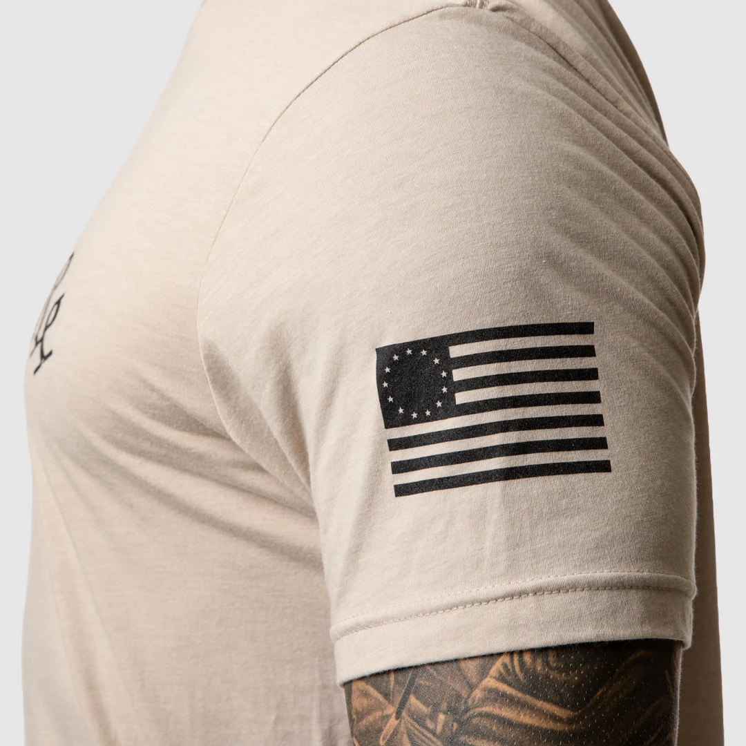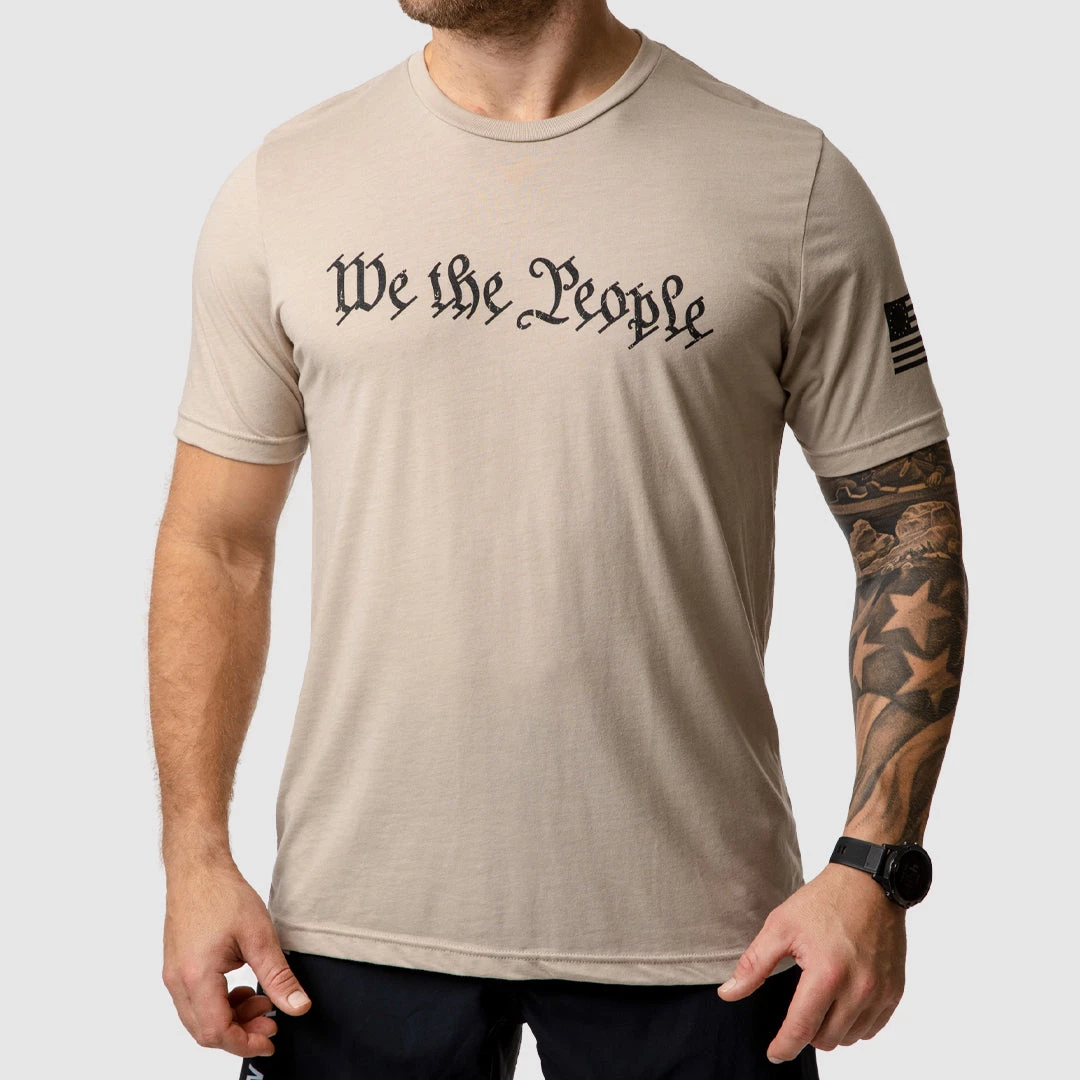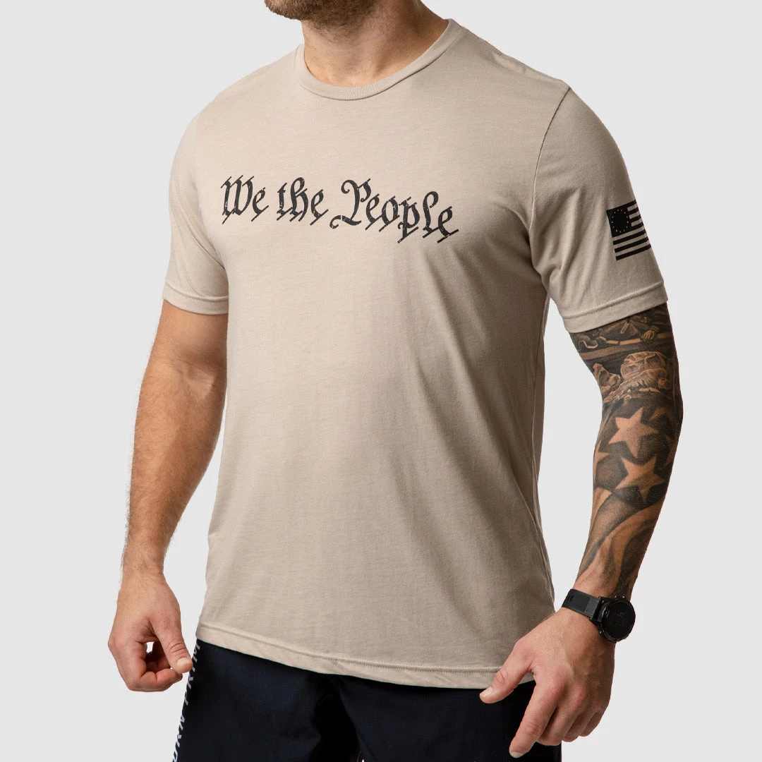 This tri-blend tee is our We The People tee. This tee features “We The People” in the font taken from the opening words of the Preamble to the U.S. Constitution. On the back of the tee it features the BP logo and 1776 in US Declaration font. On the left sleeve is the Betsy Ross flag.