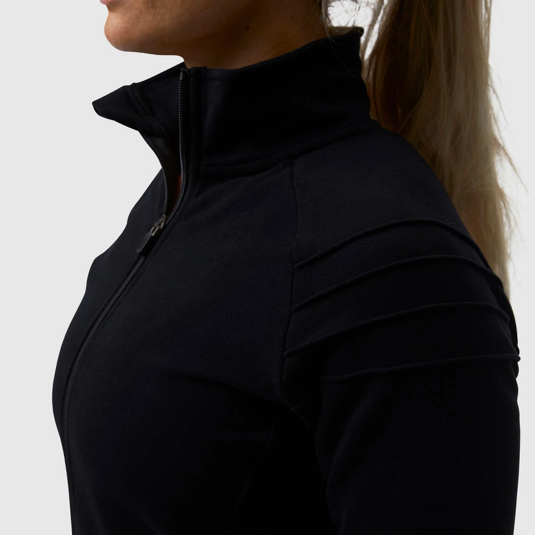 The Unmatched Moto Zip Up features a fitted zip up sweatshirt made from our incredibly soft and stretchy Unmatched fabric. This women’s black zip up sweatshirt has a full length zipper, 2 front zipper pockets, and 1 rear zipper pocket. The sleeves on this moto sweatshirt feature thumb holes and the shoulders feature a pleated design.